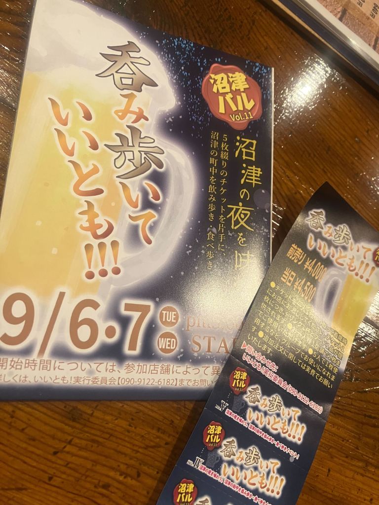 “5枚綴りのチケットを片手に、沼津の町中を飲み歩き、食べ歩き”というイベントなのですが、私も前売り券を購入して遊びに行ってきました(*´▽`*)